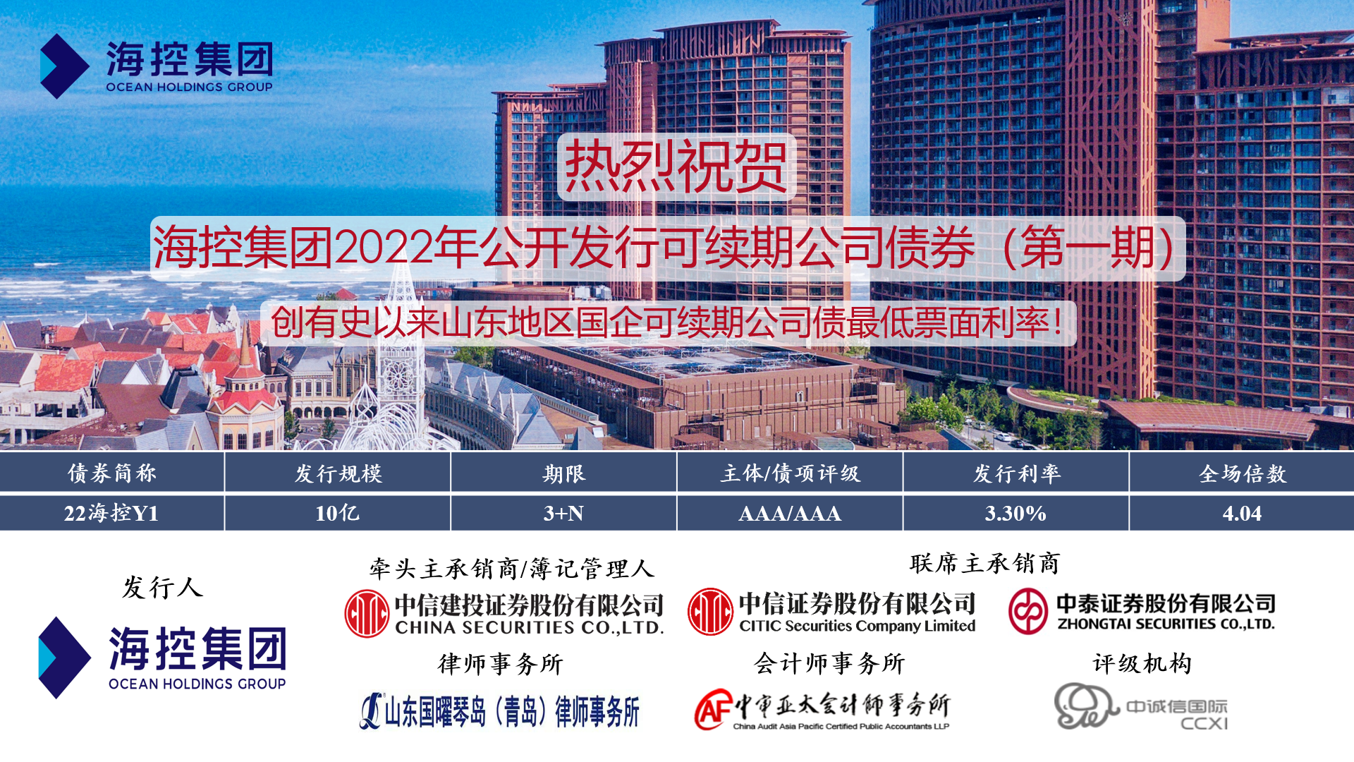 近日,??丶瘓F“2022年公開發行可續期公司債券(第一期)”成功發行,期限3+N年,發行金額10億元,認購倍數4.04,發行票面年化利率3.30%,創有史以來山東地區國企可續期公司債券最低票面利率。