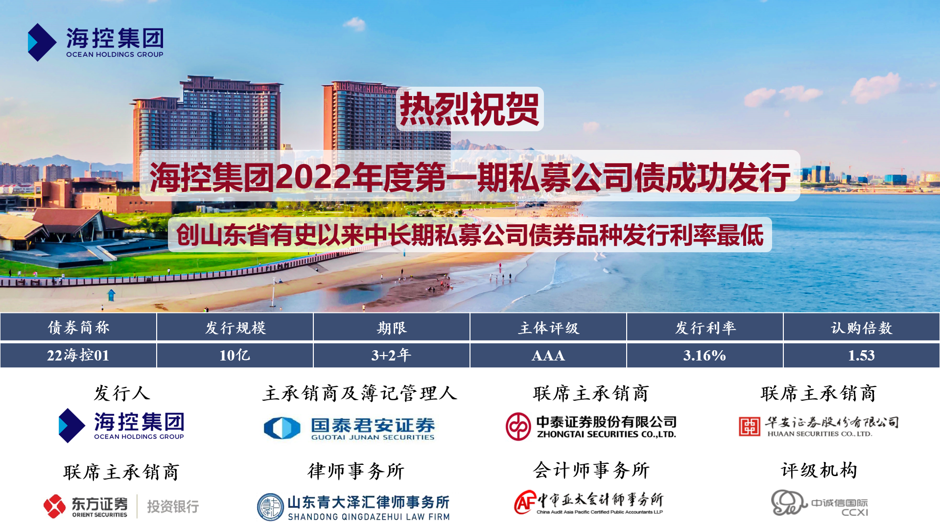 近日,海控集團“2022年非公開發行公司債券(第一期)”成功發行,期限3+2年,發行金額10億元,認購倍數1.53,發行票面年化利率3.16%,創有史以來山東地區國企中長期私募債券品種最低票面利率。