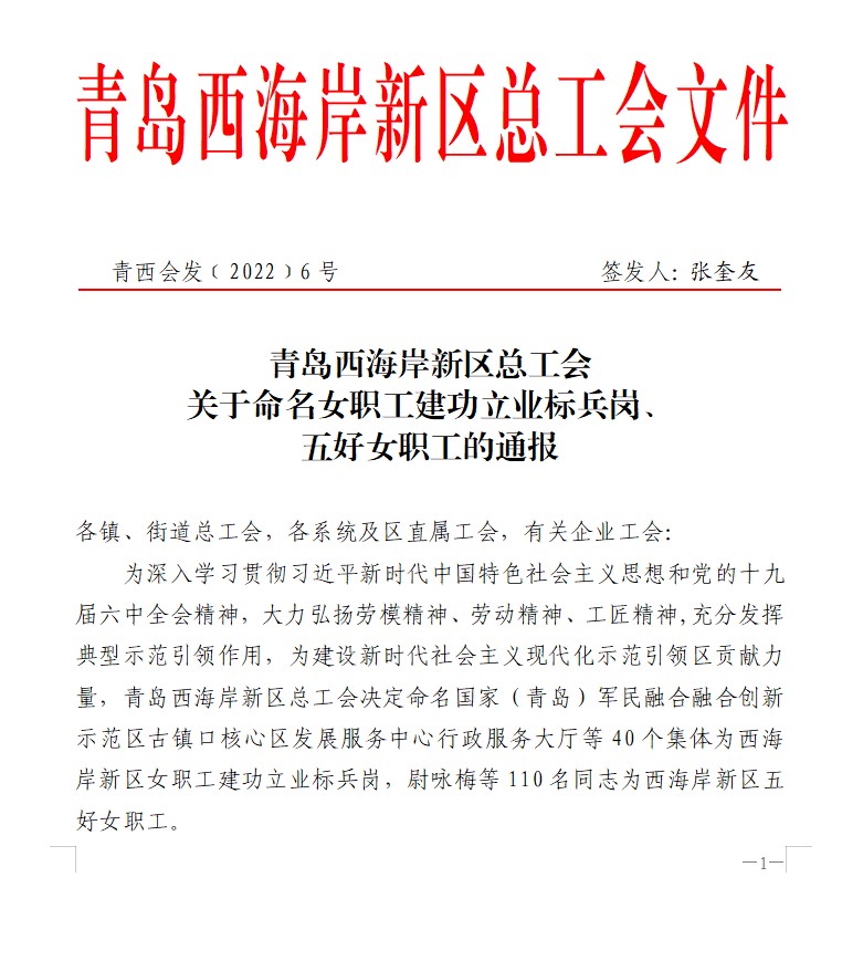 近日,青島西海岸新區(qū)女職工建功立業(yè)標兵崗名單出爐,包含40個集體,海控集團法務和風控管理崗獲評該榮譽。